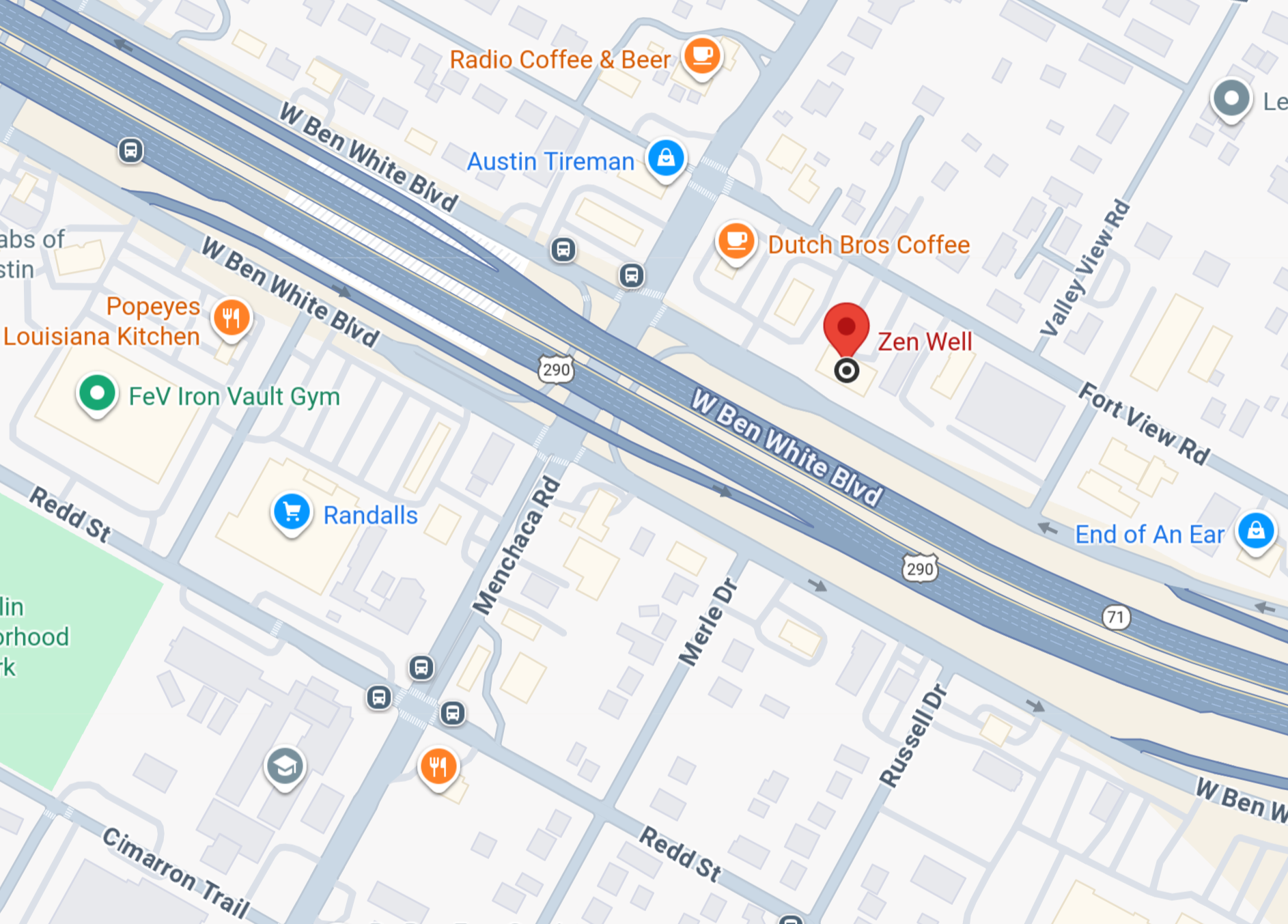 In these images you can see our location relative to the intersection of Ben White and Menchaca as well as a picture of the entrance as it appears from the street.